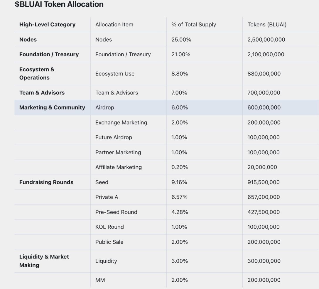 在 Web3 世界,一個(gè)項(xiàng)目的經(jīng)濟(jì)模型是其生命力的內(nèi)核。其生態(tài)代幣 BLUAI 的總供應(yīng)量固定為 100 億枚,在 TGE(代幣生成事件)時(shí),初始流通量為 12.28 億枚,占總量的 12.28%。