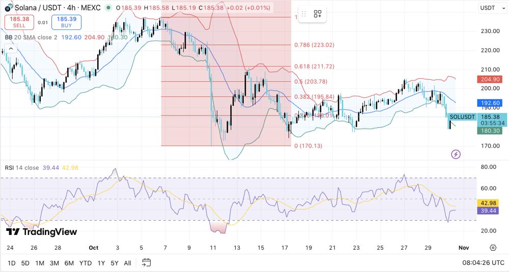 Solana (SOL) 在未能重新站上 190 美元的阻力位后,再次面臨拋售壓力。該加密貨幣目前交易價(jià)格接近 185 美元,低于布林帶中軌,表明短期動(dòng)能減弱。分析師指出,跌破近期支撐位表明賣方已重新掌控市場,動(dòng)能指標(biāo)也指向下行。