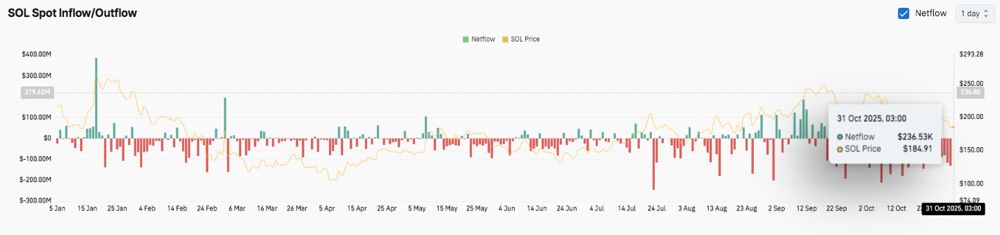 Solana 的現(xiàn)貨資金流入和流出顯示了 2025 年全年投資者情緒的變化。資金流入在 1 月和 2 月達(dá)到峰值,超過 3 億美元,表明強(qiáng)勁的吸籌勢頭。