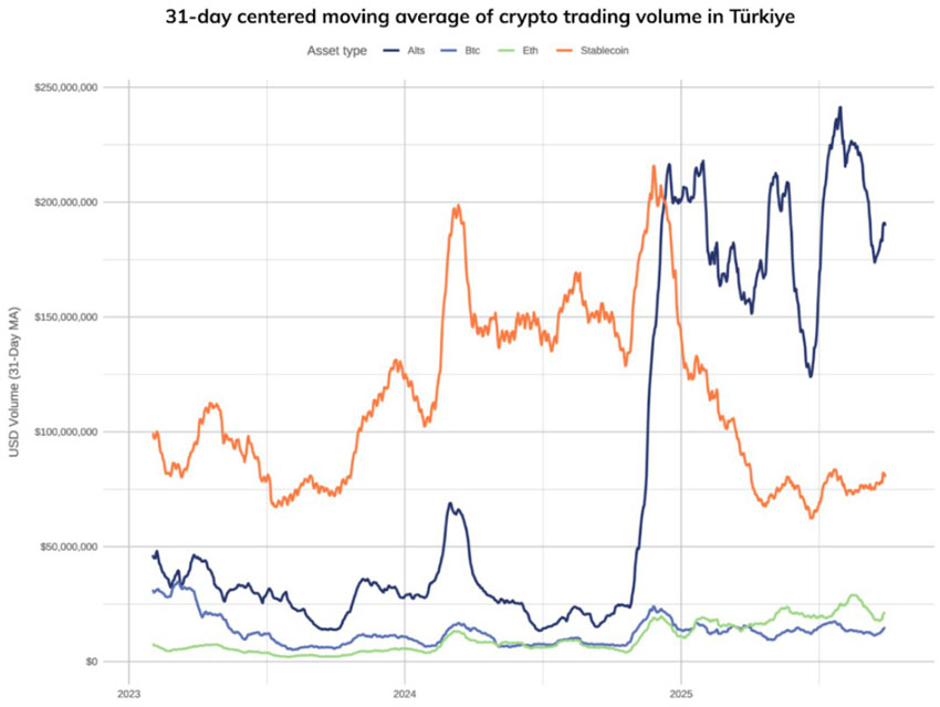針對(duì)土耳其加密貨幣采用日益投機(jī)的性質(zhì),Chainalysis強(qiáng)調(diào)了山寨幣交易的激增,以31天移動(dòng)平均值衡量,從2024年底的約5000萬(wàn)美元躍升至2025年中期的2.4億美元。