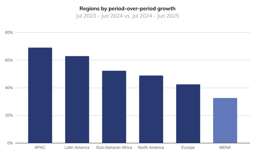 據(jù)Chainalysis稱,MENA地區(qū)同比增長(zhǎng)33%,落后于亞太(APAC)地區(qū)的69%和拉丁美洲的63%,后兩者是全球增長(zhǎng)最快的地區(qū)。