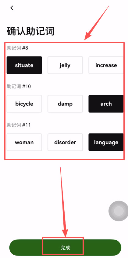 8、接下來來驗證一下助記詞。點擊【完成】?,F(xiàn)在我們的Web3錢包就已經(jīng)創(chuàng)建好了。