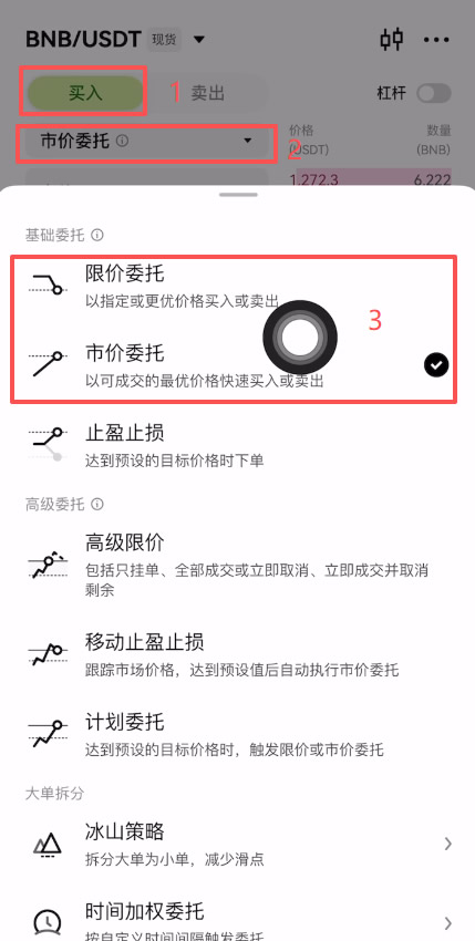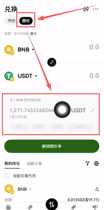 1、我們點擊下方中間的【交易】按鈕,先將我們剛才買好的BNB給它賣成USDT。上方選擇“BNB/USDT”,選擇【賣出】。還是選擇“市價委托”,因為可以快速成交。數(shù)量拉滿,點擊【賣出BNB】,點擊【確認】。就下單成功了,現(xiàn)在我們就把BNB賣成了USDT了。