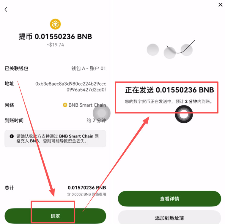 6、點擊【確認】。它告訴我們預計兩分鐘之內(nèi)就可以到賬,我們稍微等待一下。