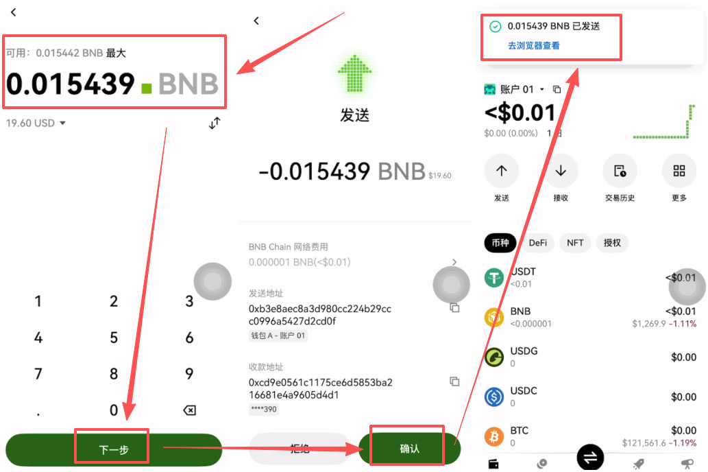 1、如果你不想在Web3錢包來進行交易了,想要把它轉回到交易所,我們就點擊上方的【發(fā)送】,再把我們的BNB轉回去。選擇要轉的幣種是BNB,收款地址我們選擇交易所錢包。