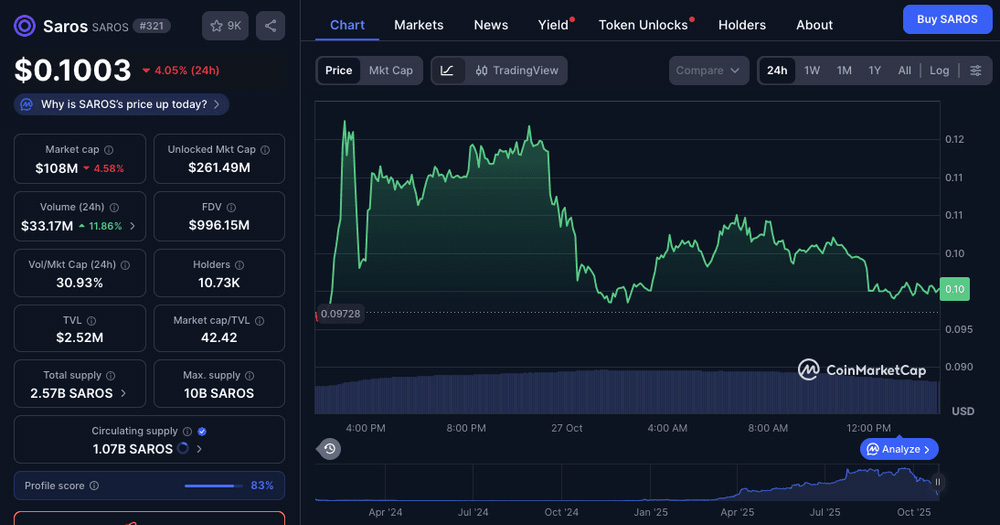 截至今天,SAROS 的交易價格為 $0.1003,過去 24 小時內漲幅為 4.04%。該代幣目前的市值為 1.08 億美元,完全稀釋估值(FDV)為 10 億美元,并且有 24 小時的交易量為 3306 萬美元。