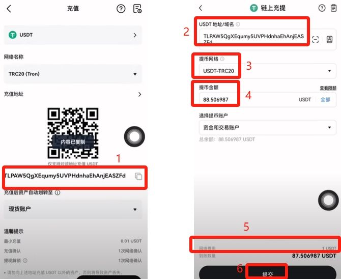 復制地址。然后返回到歐易交易所,把地址粘貼進去,提現(xiàn)網(wǎng)絡跟剛才一樣的TRC20,輸入提現(xiàn)金額,點擊【提交】就提過去了,也是要1個USDT的手續(xù)費的。
