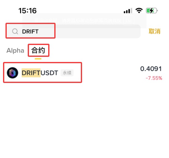3、輸入【DRIFT】,這時(shí)下拉會(huì)顯示合約DRIFT USDT,點(diǎn)擊【DRIFTUSDT】。