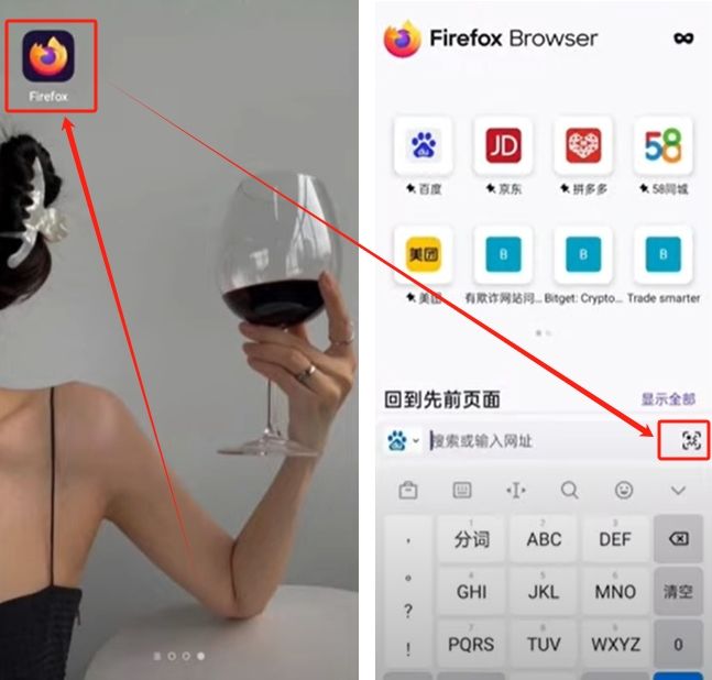 2.掃描的時(shí)候如果手機(jī)自帶的瀏覽器攔截你,就改用火狐瀏覽器(瀏覽器選擇自己喜歡的)。打開火狐瀏覽器,點(diǎn)擊下方搜索輸入網(wǎng)址,點(diǎn)擊右上角的“小方框”掃描上方二維碼。