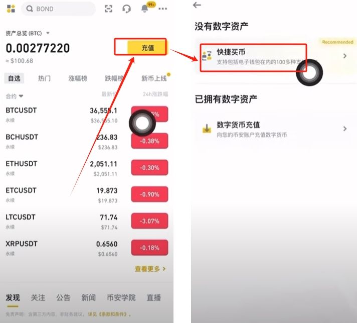 1.點(diǎn)擊幣安首頁上方的【充值】,選擇【快捷買幣】
