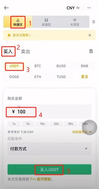 2.在上方選擇【快捷區(qū)】,右上角的“CNY”就是我們要使用的法幣,也就是人民幣的意思。選擇【買入】,購買的幣種選擇“USDT”,USDT就是泰達(dá)幣,目前幣圈使用最廣的就是USDT。其實(shí)就類似于美元,當(dāng)你使用你的法定貨幣購買了USDT之后,你就能夠使用USDT來兌換其他的任意幾百種數(shù)字貨幣。