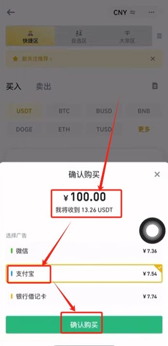 3.選擇支付方式,它會告訴我們支付100人民幣將收到12.26顆USDT。點(diǎn)擊【確認(rèn)購買】