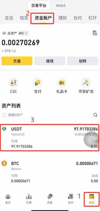 5.我們買好的USDT都會在資金賬戶里面,點(diǎn)擊右下角的【資金】,上方選擇【資金賬戶】,在這里就可以看到我們購買好的USDT了。