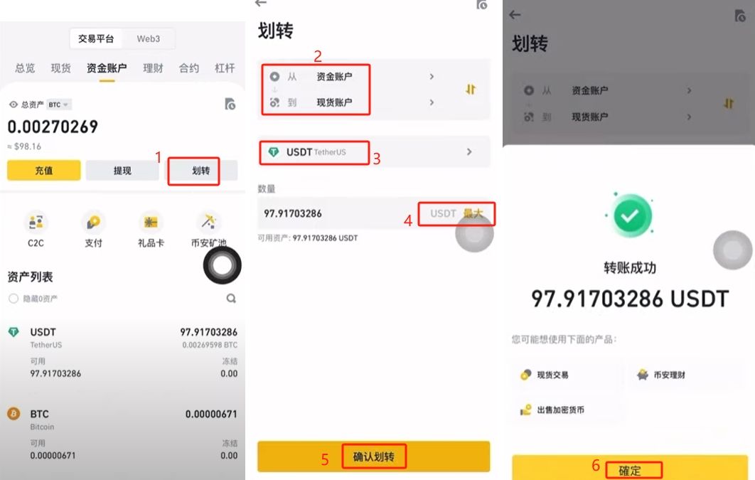 1.點(diǎn)擊上方的【劃轉(zhuǎn)】,把USDT從資金賬戶劃轉(zhuǎn)到現(xiàn)貨賬戶,幣種選擇USDT,全部劃轉(zhuǎn),點(diǎn)擊【確認(rèn)劃轉(zhuǎn)】,轉(zhuǎn)賬成功。