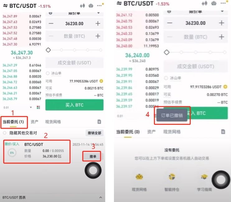 4.這里所謂的下單成功并不代表成交。只不過是我們的這個(gè)交易請求成功了。我們可以在下方【當(dāng)前委托】這里看到我們這個(gè)單子。沒有成交的單子都會在下方這里,它需要跌到我們想要的目標(biāo)價(jià)格才能成交。如果你不想等了,就可以點(diǎn)擊后面的【撤單】,把這個(gè)購買請求給它撤銷掉。點(diǎn)擊【撤單】,訂單已撤銷。掛單以及撤單如果不成交是不收取任何手續(xù)費(fèi)的。