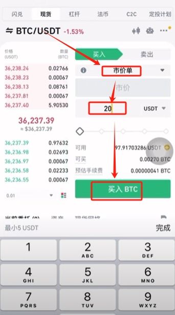 5.如果說你現(xiàn)在就想買,就可以選擇【市價(jià)單】,市價(jià)單就是他會以當(dāng)前市場最合適的價(jià)格給我們,直接輸入要購買的金額就可以購買成功。輸入“20”,點(diǎn)擊【買入BTC】