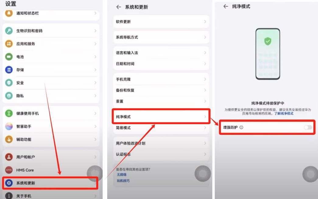 5.安卓手機(jī)在安裝的時(shí)候,也有可能出現(xiàn)手機(jī)不允許你安裝的情況,華為手機(jī)要到【系統(tǒng)和更新】里面找到【純凈模式】,在純凈模式里面把“增強(qiáng)保護(hù)”給他關(guān)了。