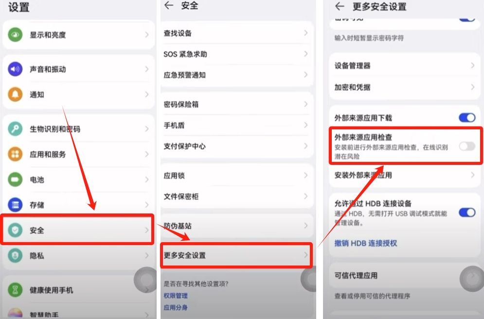 6.并且要在【設(shè)置】里面找到【安全】,點(diǎn)擊【更多安全設(shè)置】,關(guān)閉里面的【外部來源應(yīng)用檢查】