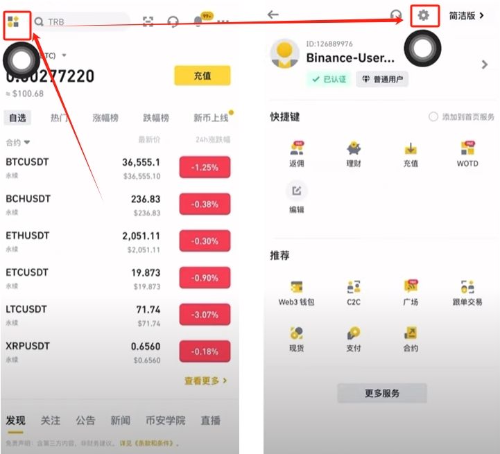 1點(diǎn)擊幣安左上角的圖標(biāo),找到上方的“小齒輪”就是設(shè)置按鈕,點(diǎn)擊它。