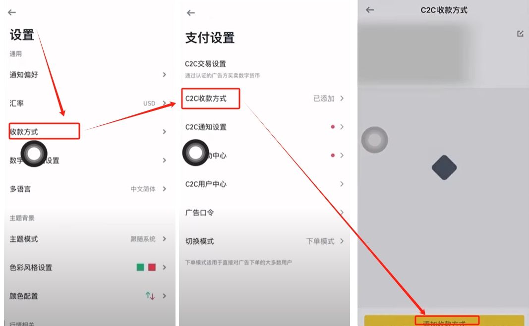 2.點(diǎn)擊【收款方式】,選擇第一個(gè)【C2C收款方式】,在下方點(diǎn)擊【添加收款方式】