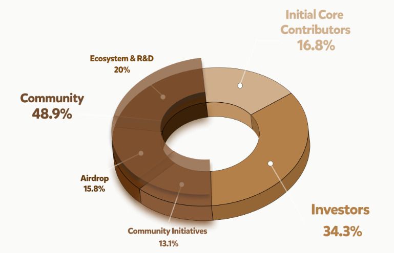 具體來說,在 48.9% 的資金中,15.8% 將用于空投(免費分發(fā)),13.1% 將用于其他社區(qū)活動,20% 將用于生態(tài)系統(tǒng)發(fā)展基金以支持開發(fā)者。