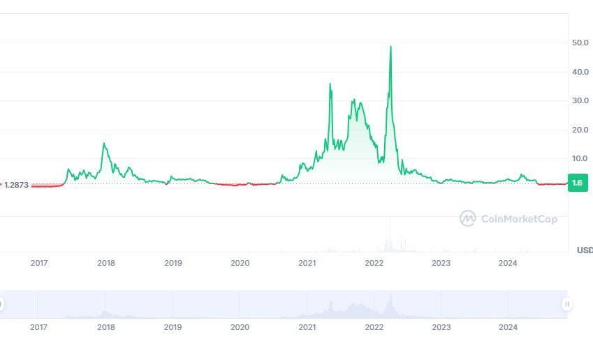 2019-2021年: 2020年11月起,該加密貨幣價格在0.50美元至4美元之間波動,隨后在2021年5月初飆升至41美元,并在月底跌至12美元。在7月中旬加密貨幣市場整體低迷時期,該加密貨幣價格觸底,并在9月9日回升至34美元左右,之后又跌至11美元左右。隨后,該加密貨幣價格在10月中旬飆升至34.56美元。然而,從2021年末開始,加密貨幣市場再次開始下跌。