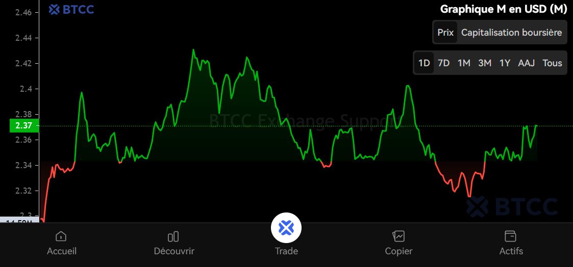 截至2025年8月4日,M代幣在BTCC市場上的價格為0.4368美元,較過去24小時上漲了2.24%。自推出以來,M代幣的價格已累計上漲近700%。
