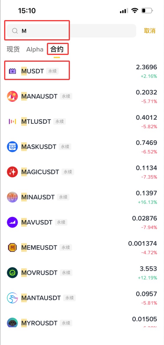 3、輸入【M】,這時下拉會顯示合約M USDT,點擊【MUSDT】。