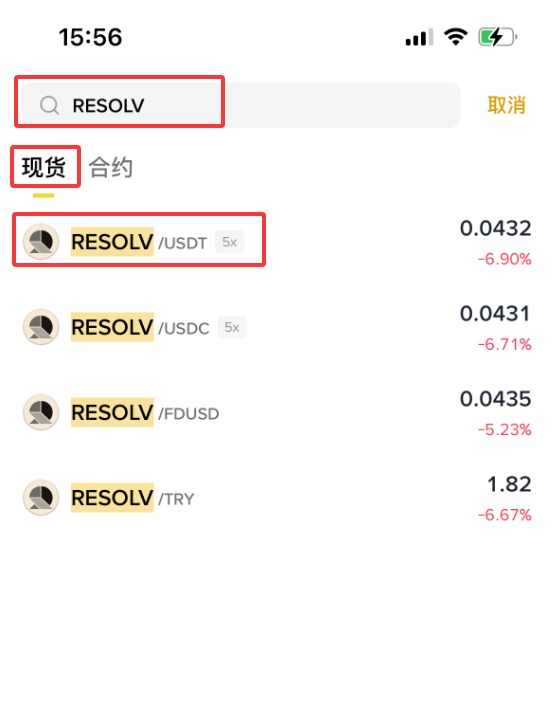 3、輸入【RESOLV】,這時(shí)下拉會(huì)顯示【現(xiàn)貨】【RESOLV/ USDT】,點(diǎn)擊【RESOLV/ USDT】。(作為新手,不建議做合約,所以這里就不演示合約購(gòu)買方式了。)