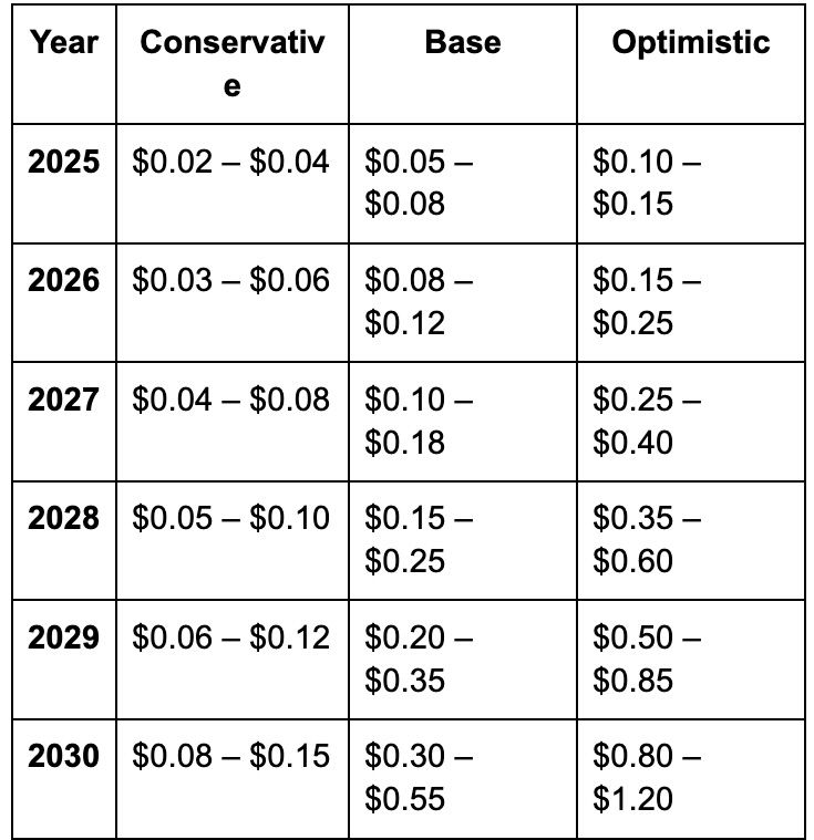 以下預(yù)測場景僅為 說明性質(zhì) ,不構(gòu)成財(cái)務(wù)建議。它們基于潛在采用率、宏觀加密市場周期以及類似互操作性項(xiàng)目的歷史類比。