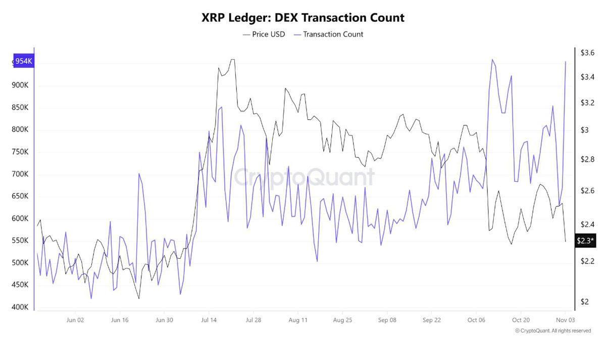 同樣,CryptoQuant的數(shù)據(jù)報(bào)告稱,XRP Ledger的本地去中心化交易所(DEX)活動(dòng)創(chuàng)下紀(jì)錄,954000筆交易標(biāo)志著最近幾個(gè)月最活躍的一天。