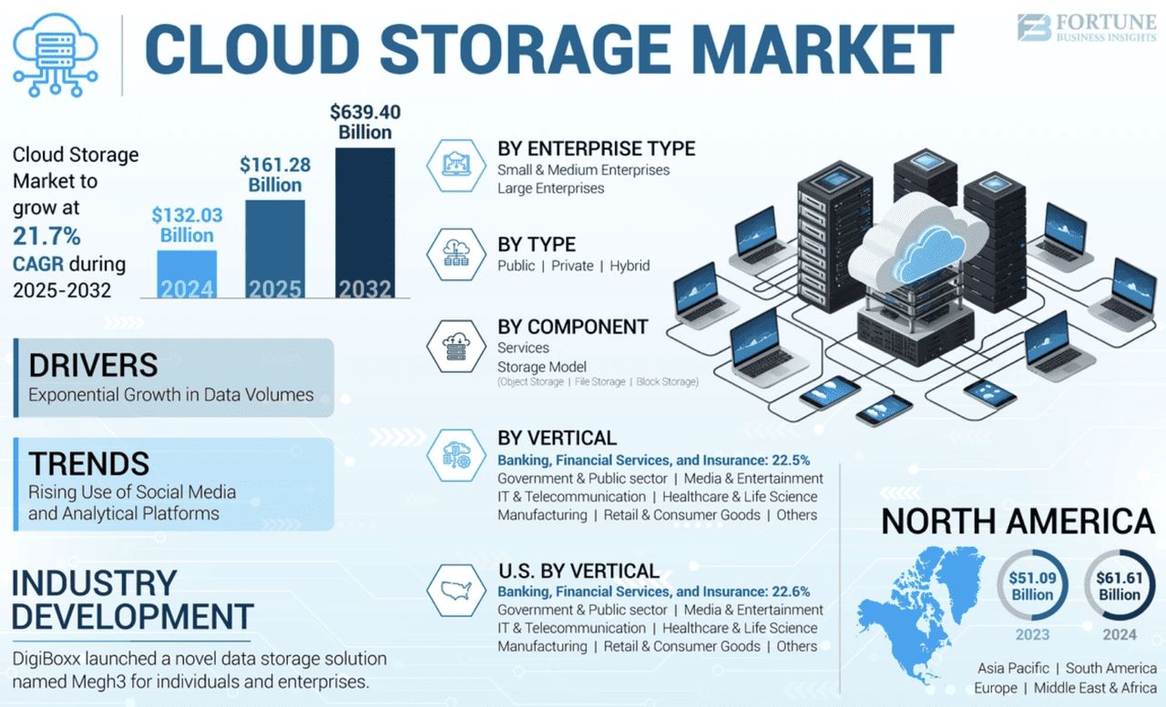 根據(jù) Fortune Business Insights (2025) 報導(dǎo),全球云存儲市場在 2024 年估值為 1,320.3 億美元,預(yù)計在 2025 年將達到 1,612.8 億美元,從 2025 年到 2032 年的復(fù)合年增長率 (CAGR) 為 21.7%。IMARC Group 的另一項預(yù)測估計,到 2033 年市場將擴大到 4,905.6 億美元,復(fù)合年增長率為 16.34%。