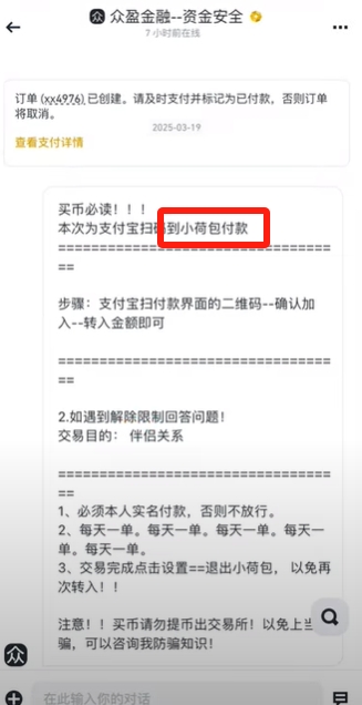 這個時候我們的訂單就生成了,平臺就把我買了的單子劃給了商家。我們就可以來到聊天框這里,看一下賣家有哪些要求??梢钥吹剿枰覀儗嵜D(zhuǎn)賬,不要備注任何信息,這兩個還是比較基礎的要求了。如果我們想要交易的順利進行,就必須按照商家的要求去做。點擊【獲取付款詳情】。