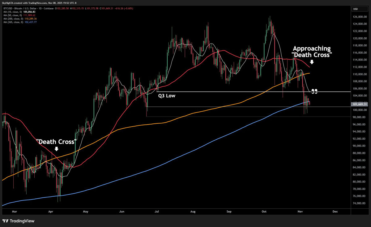 以上就是比特幣(BTC)多頭能否避開102萬美元的周期第四次"死亡交叉"?的詳細內容,更多關于比特幣“死叉”四度來襲的資料請關注腳本之家其它相關文章!