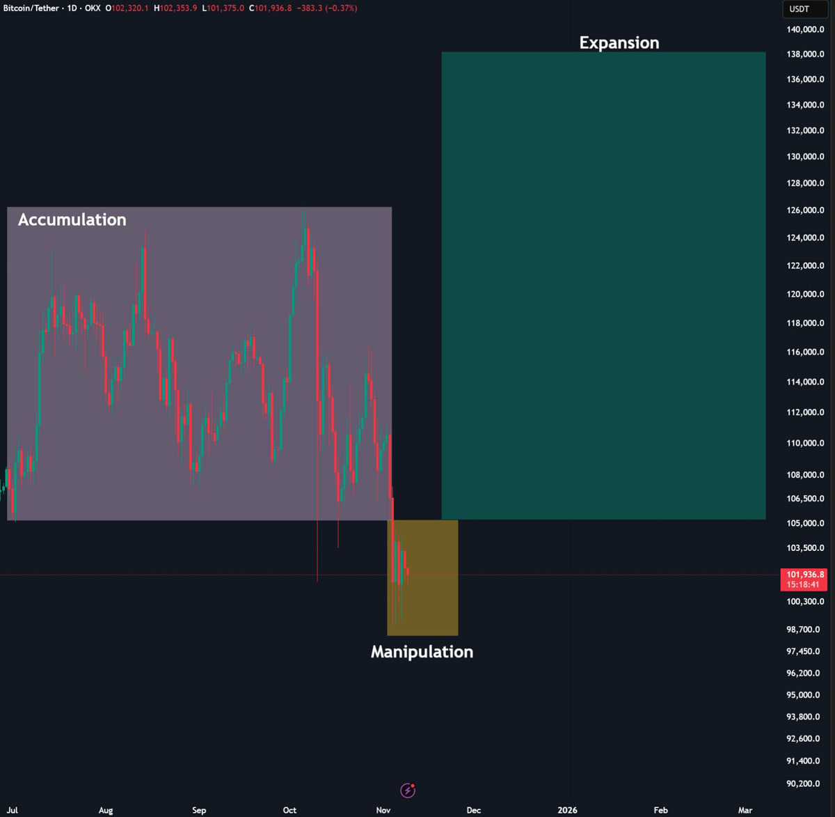 Abbe 在 X 上上傳了一張圖表,該圖表表明停擺的結束也可能標志著 BTC 價格行動“操縱”階段的結束。