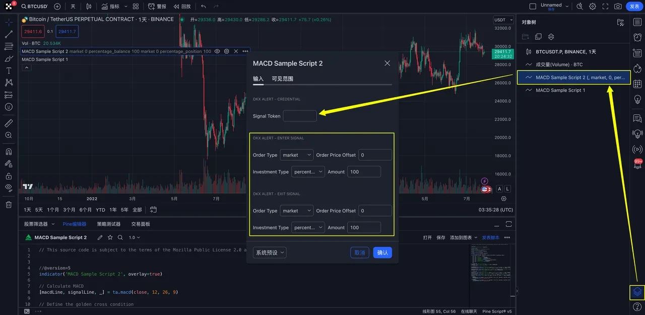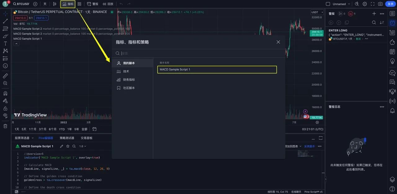 步驟2:點(diǎn)擊“指標(biāo)”,在“我的腳本”中選擇想要使用的信號(hào)。對(duì)于新用戶,歐易準(zhǔn)備了一個(gè)MACD模板派語言代碼,方便新用戶使用信號(hào)策略。