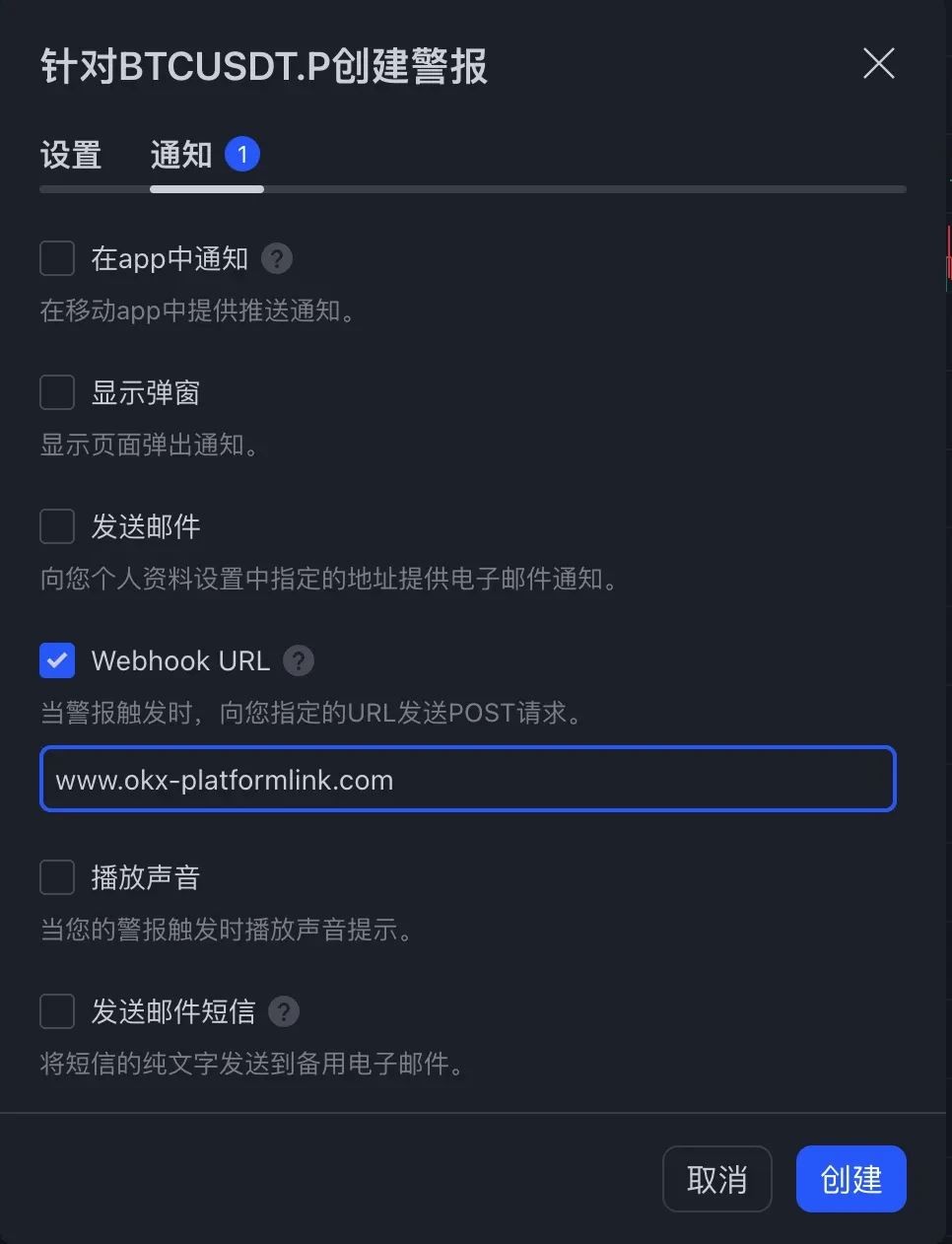步驟3:在“通知”中選擇Webhook URL。將此前歐易自動(dòng)生成的Webhook URL粘貼到TradingView,然后點(diǎn)擊“創(chuàng)建”。