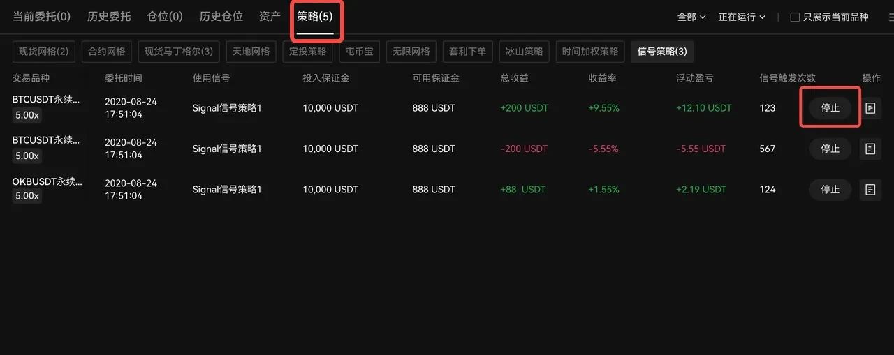 當(dāng)用戶停止信號(hào)策略后,系統(tǒng)將自動(dòng)取消策略所下的所有待處理訂單。訂單中的剩余資產(chǎn)將退還到用戶的交易賬戶。停止信號(hào)策略有兩種方法可以選擇。