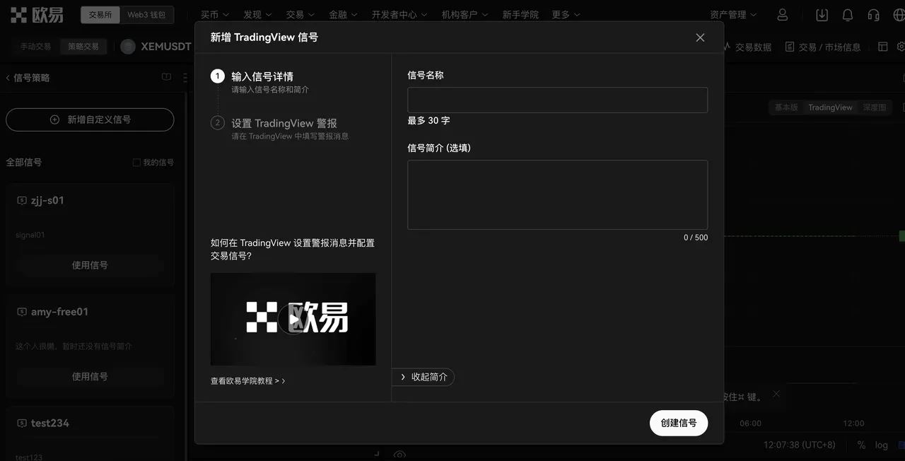 信號(hào)策略的推出,讓TradingView用戶和信號(hào)供應(yīng)商可以使用自己的TradingView信號(hào)發(fā)布并設(shè)置一個(gè)信號(hào)策略,如果用戶想要在歐易上進(jìn)行信號(hào)交易,可以參考以下步驟