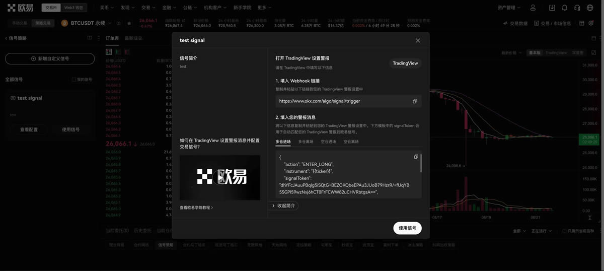 完成前面的步驟,就能看到TradingView信號(hào)已接入到歐易。下面的步驟就是要將已經(jīng)接入的信號(hào),連接到信號(hào)策略。點(diǎn)擊“使用信號(hào)”,開始創(chuàng)建信號(hào)策略。