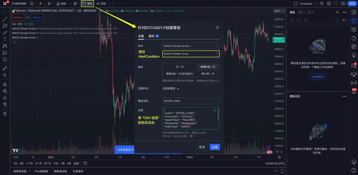 步驟2:點(diǎn)擊頂部工具欄上的“Alert”,并將"條件"更改為剛剛添加到圖表中的相應(yīng)AlertCondition腳本。在這種情況下,MACD金叉與ENTER_LONG消息模板一起使用。為方便起見,還可以選擇“無限制警報(bào)”作為到期時(shí)間。最后,在“消息”下粘貼歐易警報(bào)信息規(guī)格說明。點(diǎn)擊這里,了解歐易警報(bào)信息規(guī)格說明更多信息。