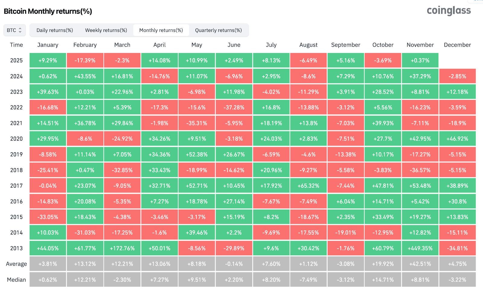 十月的逆轉(zhuǎn)令許多將其視為Bitcoin 歷史上最強(qiáng)月份的交易者感到意外。 Coinglass 數(shù)據(jù)顯示,過(guò)去七年十月均錄得穩(wěn)定增長(zhǎng),平均單月回報(bào)超過(guò)20%。今年,這一趨勢(shì)急劇反轉(zhuǎn),數(shù)位資產(chǎn)自歷史高點(diǎn)$126,142 跌至關(guān)稅沖擊后的$104,782 附近低點(diǎn)。