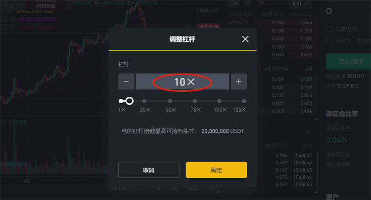 幣安合約支持手動(dòng)調(diào)整杠桿倍數(shù),最大125倍。所以,您可以跳轉(zhuǎn)到頁(yè)面頂部,然后單擊黃色框,提示您當(dāng)前的杠桿金額(默認(rèn)為20倍)。通過(guò)調(diào)整滑塊或手動(dòng)輸入數(shù)字來(lái)指定杠桿,然后單擊“確認(rèn)”。