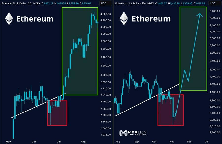 早期的例子最終使ETH從$2,600上升至幾乎$4,600,僅在幾周內。雖然歷史并不總是完美重復,但交易者通常會觀察這些模式,以尋找動量轉變的早期跡象。