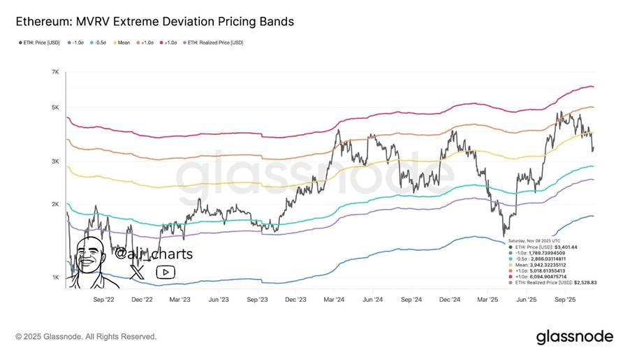 分析師阿里·馬丁內茲提供了一個更具結構性的觀點。根據Glassnode的MVRV極端偏差帶,他強調了三個主要支撐位:$2,866、$2,528和$1,789。