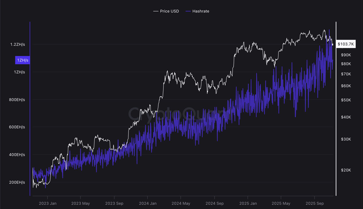 比特幣網(wǎng)絡算力持續(xù)攀升,已突破每秒1 zetahash(ZH/s)。來源:CryptoQuant