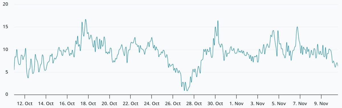 周一,BTC期權(quán)skew指標(biāo)(看跌-看漲)降至6%,標(biāo)志著11月份首次觸及中性至看跌市場(chǎng)的邊緣。分析師指出,當(dāng)交易者預(yù)期出現(xiàn)明顯調(diào)整時(shí),該指標(biāo)通常會(huì)攀升至10%或更高,因?yàn)榭吹ㄙu出)期權(quán)交易溢價(jià)明顯。目前尚不明確什么因素能恢復(fù)交易者對(duì)潛在12萬美元上漲的信心,但當(dāng)前市場(chǎng)格局明確透露出懷疑情緒。