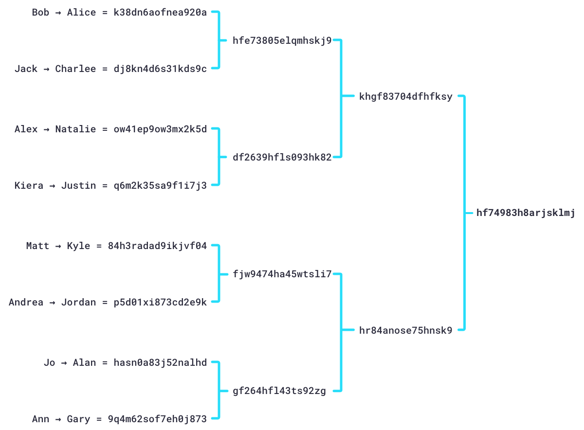 現(xiàn)在我們有了一組已被壓縮成哈希值的交易數(shù)據(jù)。接下來,我們將哈希值兩兩配對(duì),并為每對(duì)哈希值創(chuàng)建一個(gè)新的哈希值,從而進(jìn)一步壓縮這些數(shù)據(jù)。如此反復(fù),直到整個(gè)交易數(shù)據(jù)都由一個(gè)單獨(dú)的哈希值表示為止。