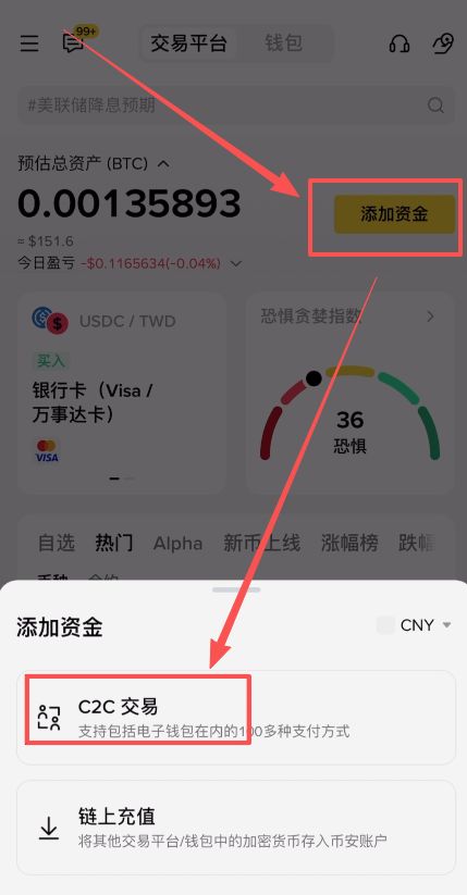 買幣也就是我們俗稱的入金,用本地貨幣購買USDT、USDC這兩大穩(wěn)定幣。我們點擊這里的【添加資金】,選擇【C2C交易】。
