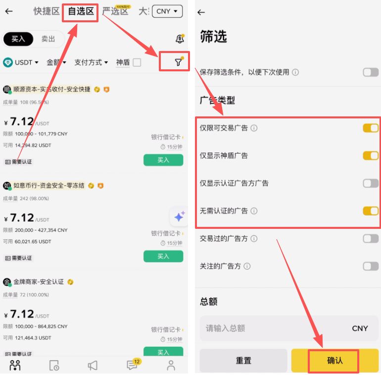 首先,我們點擊右邊這個小漏斗的圖標,把“僅限可交易廣告”打開,“僅顯示神盾廣告”打開,以及“無需認證的廣告”打開。這樣我們就可以找到那些既安全,交易又方便的商家。點擊【確認】。